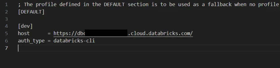 To configure it, simply copy the host and auth_type values from your dev profile and paste them under the DEFAULT section within the .databrickscfg file.